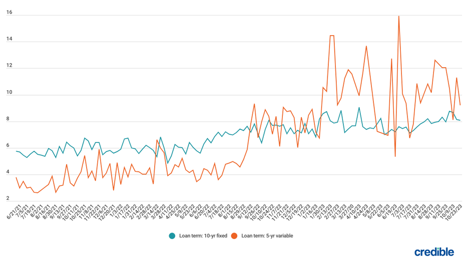 During the week of Oct. 23, 2023, average private student loan rates fell for borrowers with credit scores of 720 or higher who used the Credible marketplace to take out 10-year fixed-rate loans and 5-year variable-rate loans.